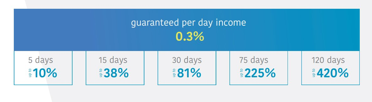 Program investasi crypto akan tersedia dalam lima varian yang berbeda: 5, 15, 30, 75 dan 120 hari, masing-masing 10%, 38%, 81%, 225% dan 420% dari pendapatan terjamin. Penghasilan harian minimum aman adalah 0,3%. Anda dapat menggunakan CICoin untuk memasukkan salah satu kontrak, menerima, dan bonus yang Anda terima untuk kontrak Anda.